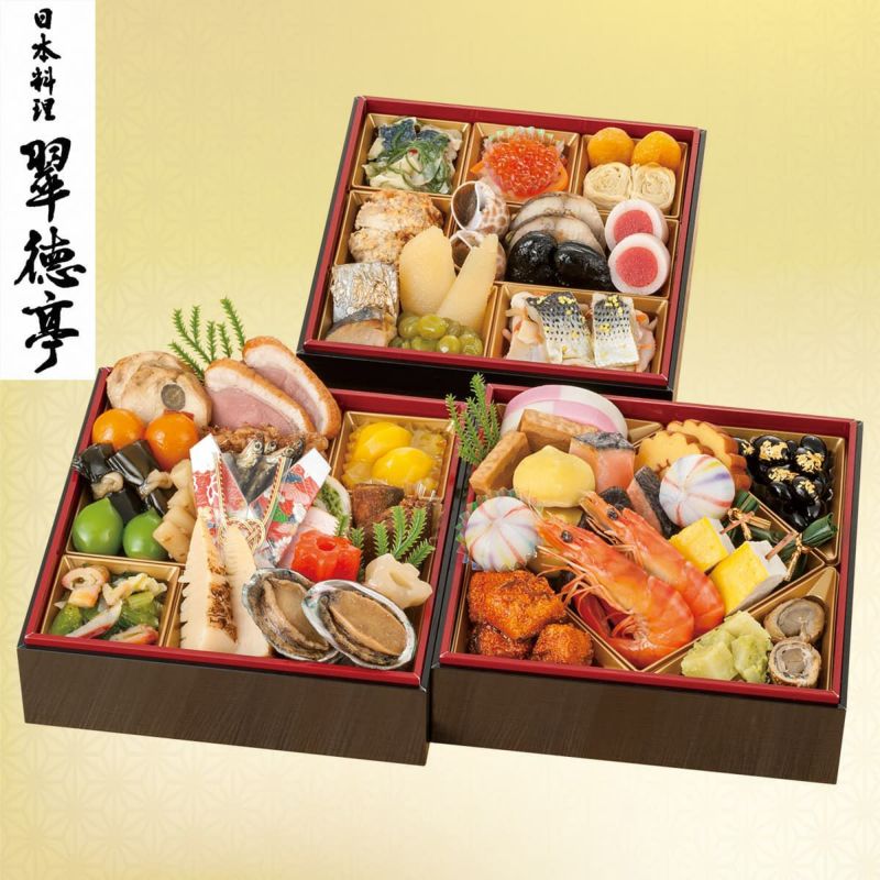 平成15年に厚生労働大臣表彰 現代の名工(卓越した技能者)、平成21年黄綬褒章を受賞した森口 冨士夫氏が店主の「翠徳亭」。卓越した技術を活かし、伝統的なおせちに仕立てた店主監修の三段重です。【数量限定】