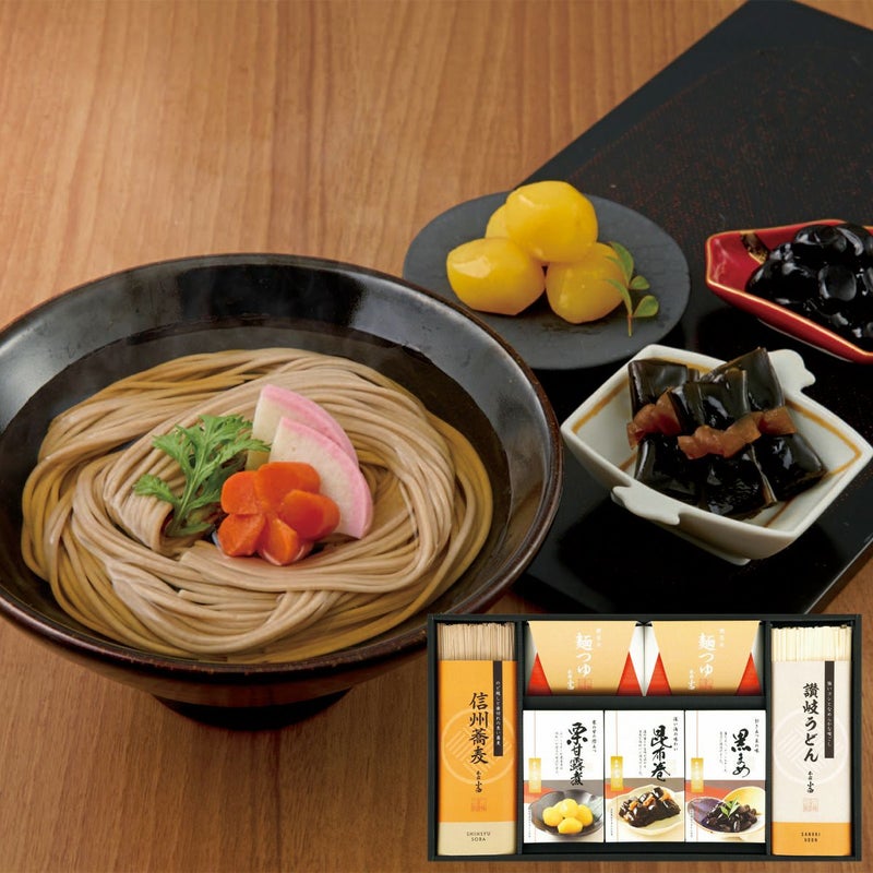 信州そばと讃岐うどん、おせち料理にも使われる縁起のよい具材「昆布巻」「黒豆」「栗甘露煮」を詰め合わせました。