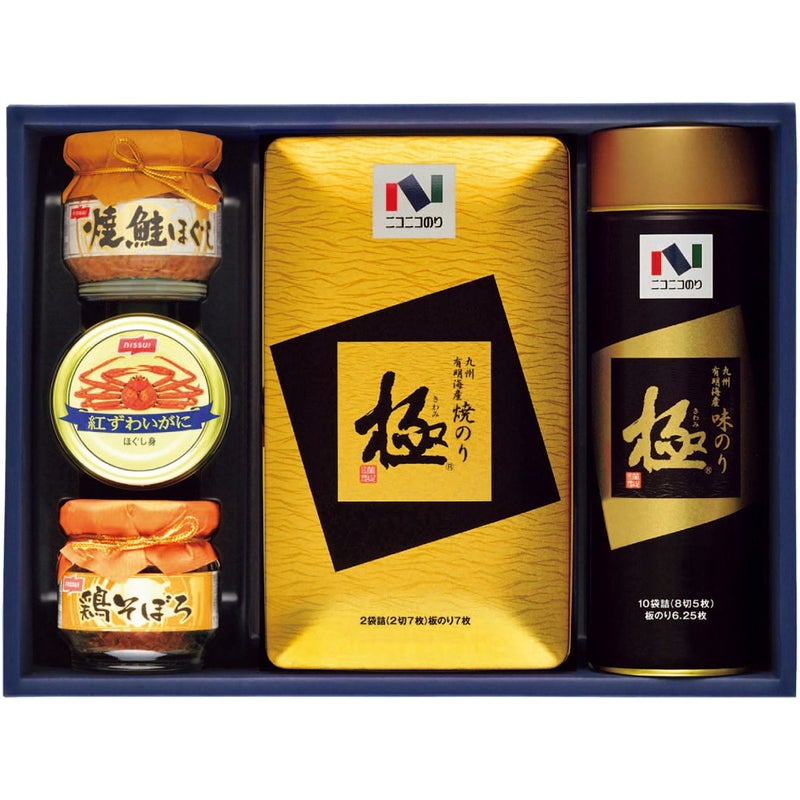 九州有明海産の上質な海苔「極」の味のりと焼のりに缶詰、瓶詰を詰め合わせました。